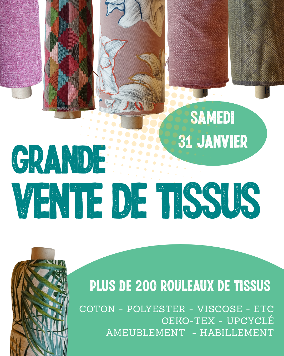 Que vous soyez couturier·e, créateur·rice ou bricoleur·se, c’est le moment parfait pour venir dénicher tout ce qu’il vous faut à petit prix : du tissu d’ameublement, du tissu certifié Oeko-Tex, et bien plus encore !